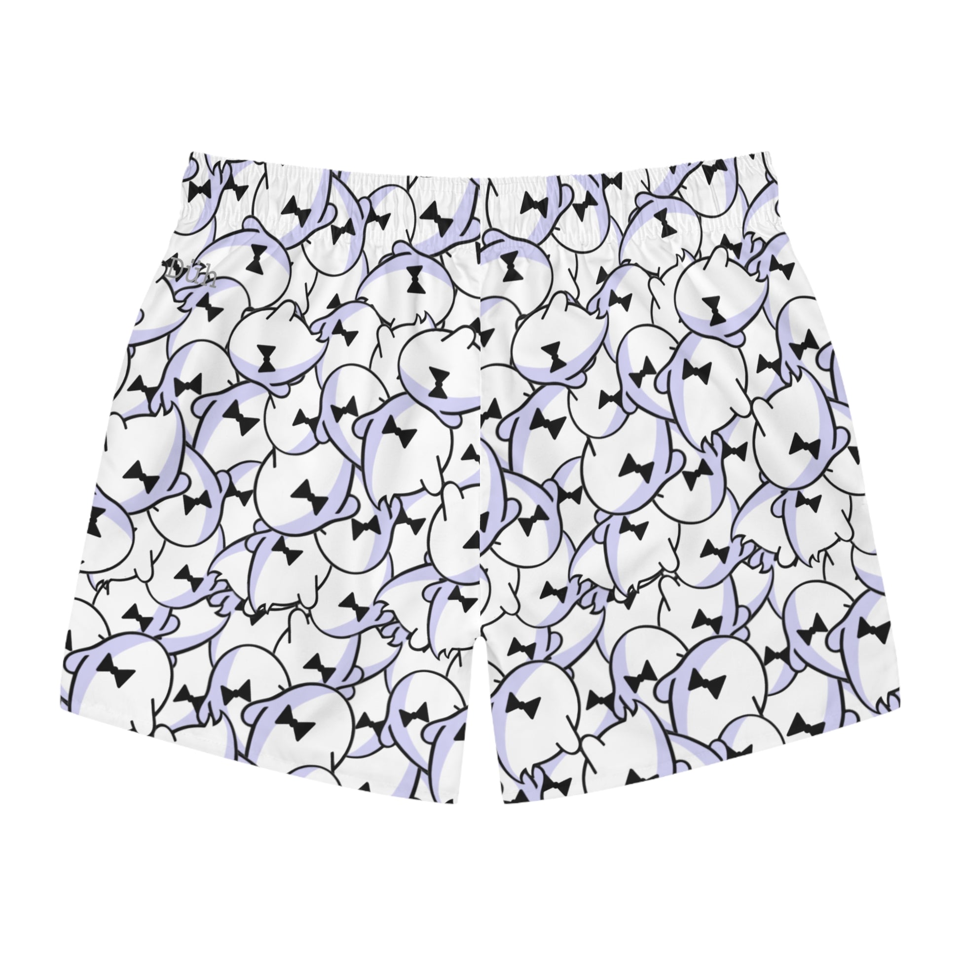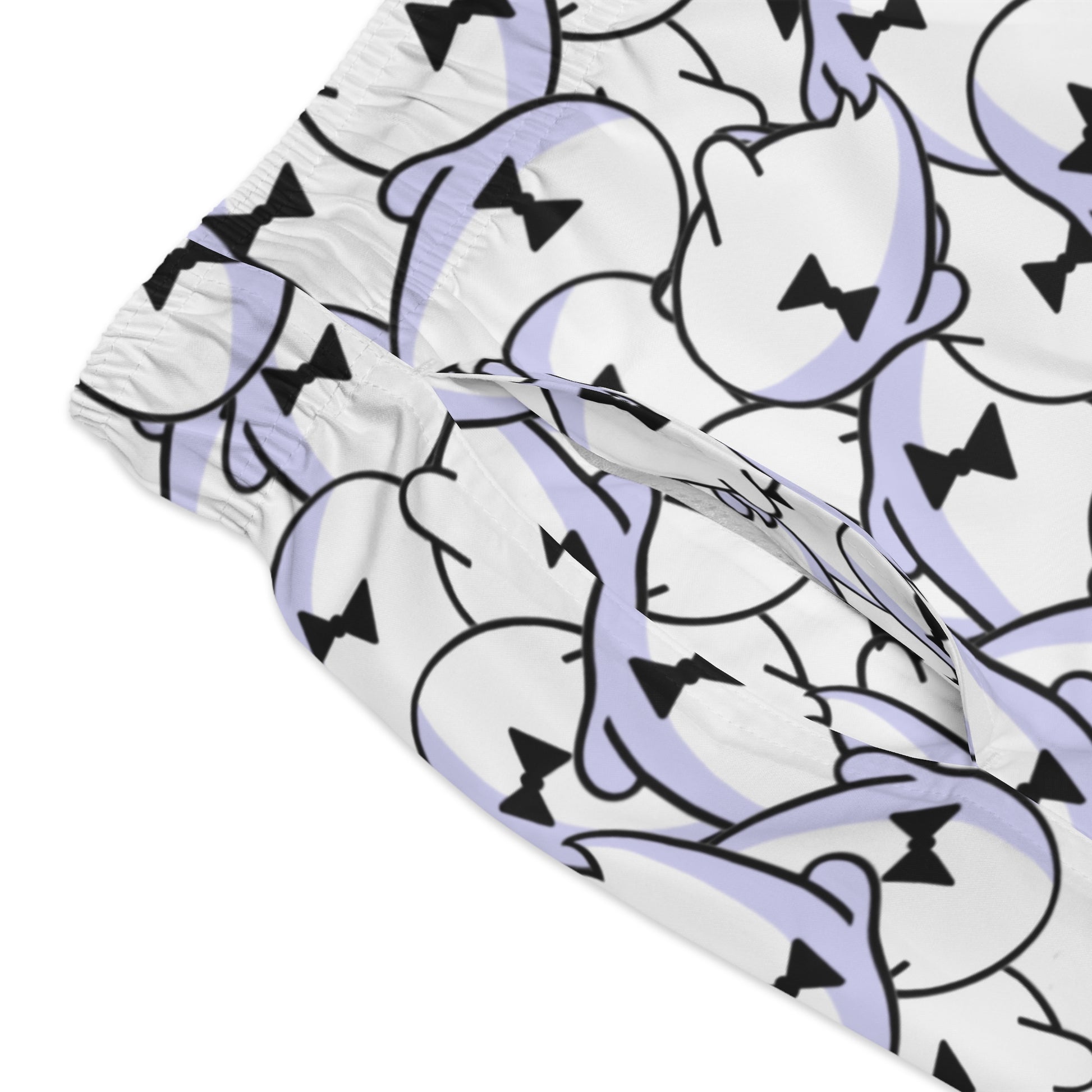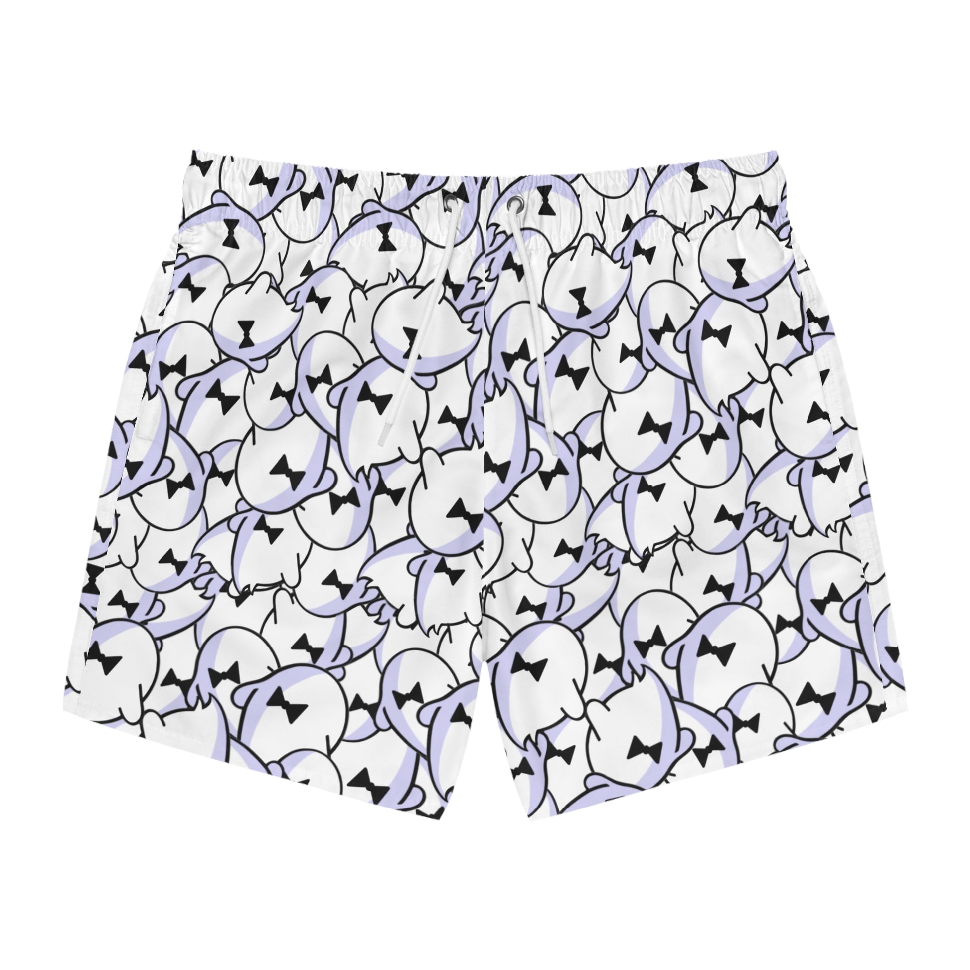 These lightweight swim trunks bring playful energy to warm days by the water. A repeat pattern of soft lilac and black abstract faces dances across a bright white background, giving the shorts a modern, slightly quirky vibe that reads both fun and refined. Cut for easy movement and quick drying, they layer over the mesh lining for comfortable wear from sand to street. The elastic drawstring waist lets you dial in the fit, while the reinforced side seams keep the silhouette tidy even after repeated wear. Wear them when you want swimwear that feels personal — relaxed, slightly mischievous, and ready for spontaneous dips or breezy boardwalk hangs.