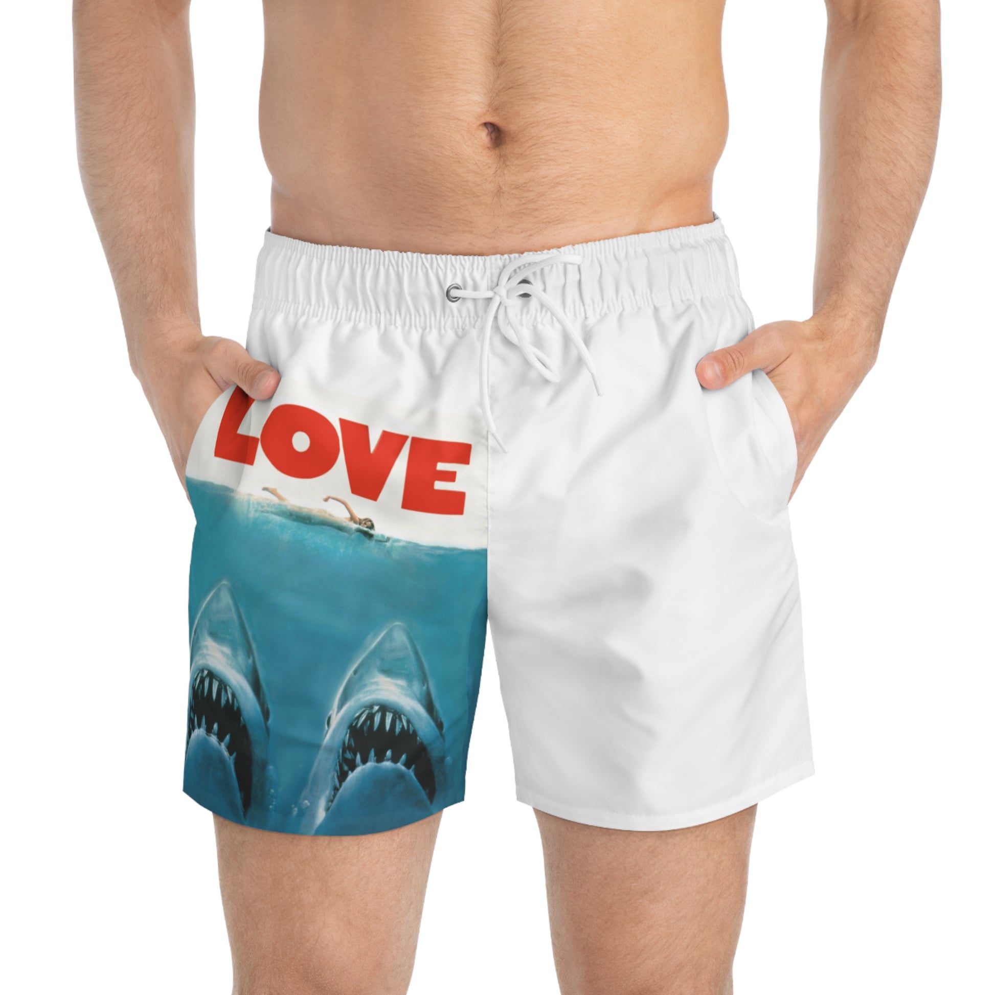These swim trunks feel like a cheeky, sun-splashed nod to classic beach thrills. Lightweight and fast-drying, they carry a bold, retro-inspired print: a striking ocean scene with twin sharks rising beneath a swimmer and the punchy red word “LOVE” above — equal parts playful and provocative. The elastic drawstring waist and mesh-lined pockets keep things practical while the vivid all-over print stays crisp after many swims. Wear them for long, hot afternoons at the shore, pool parties that lean irreverent, or weekend escapes where you want swimwear that starts conversations and keeps you comfortable.